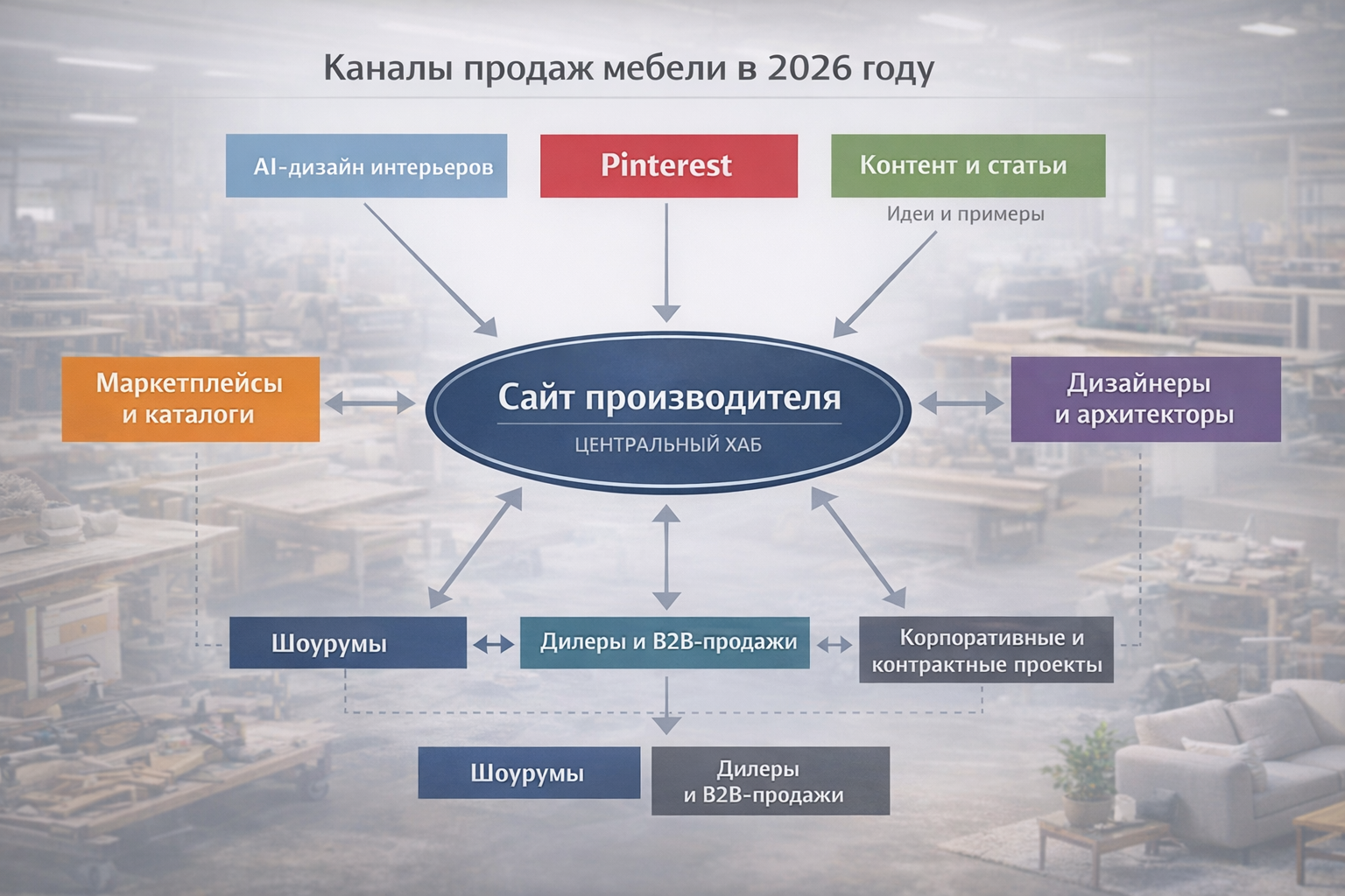 Важно понимать: AI-дизайн и Pinterest не отменяют классические каналы продаж мебели.