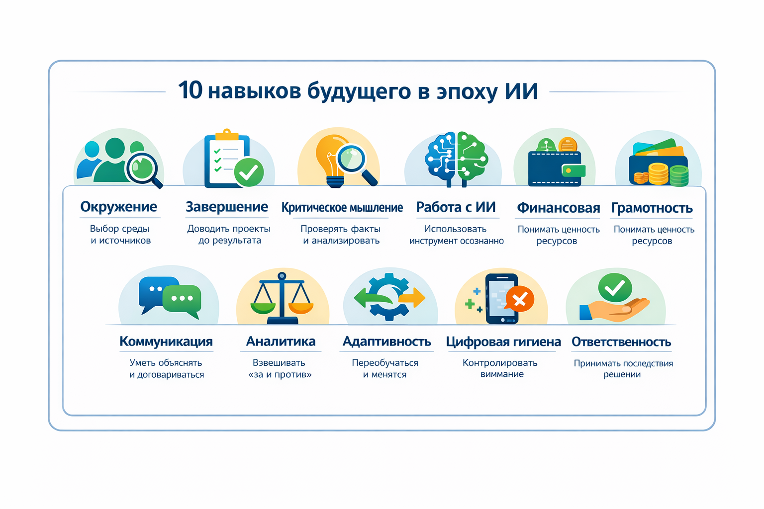 Навык переобучения становится важнее одного диплома. Технологии будут меняться, профессии — тоже. Умение осваивать новое, не «ломаясь» от изменений, — ключевой ресурс.