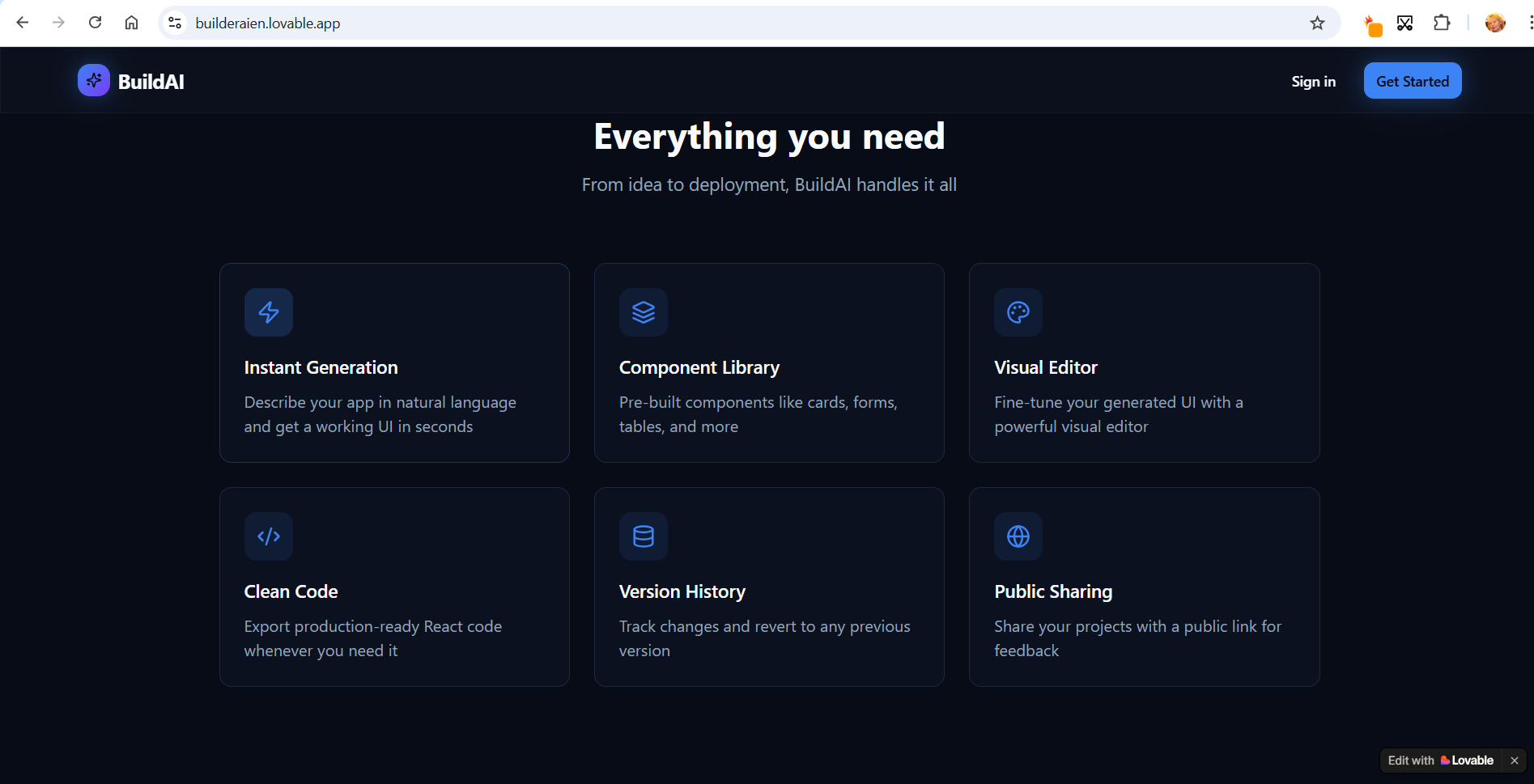 BuilderAI — это мой экспериментальный AI no-code проект, созданный с помощью платформы Lovable. Идут последние доработки и будет представлен в открытом доступе.