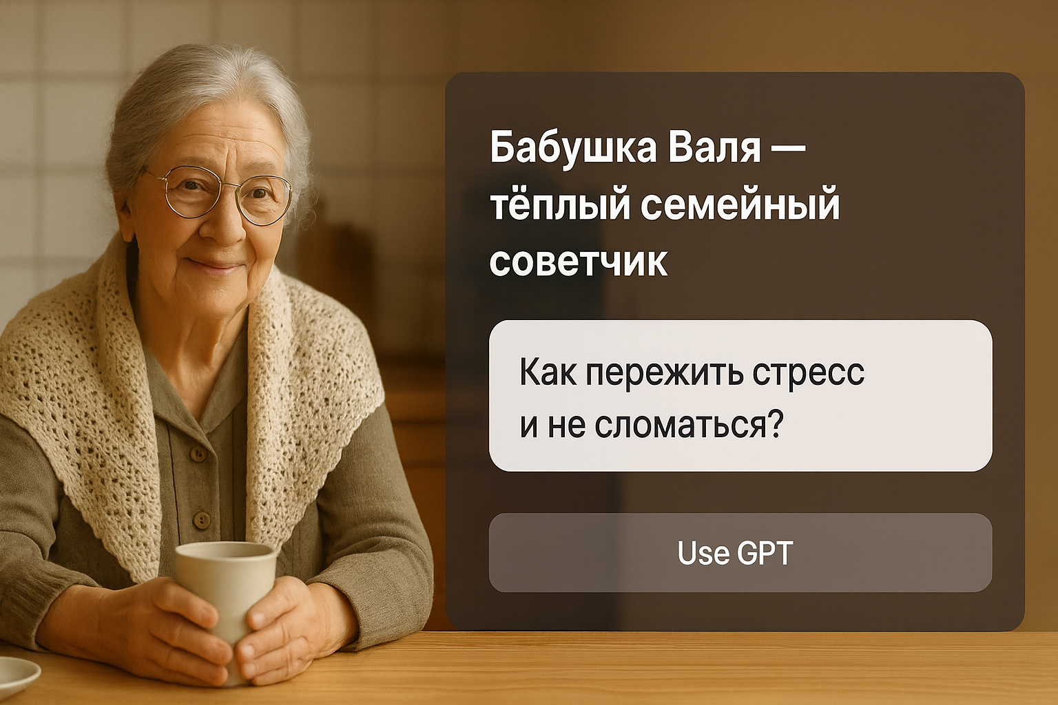 Рассмотрим эту механику на примере «Бабушки Вали» — тёплого семейного советчика, созданного как GPT. Идея проста: дать пользователю мягкий, спокойный голос, который помогает разобраться в отношениях, детях, бытовых ситуациях и сложных эмоциях.